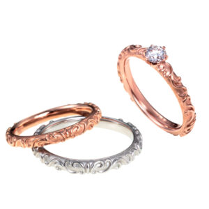 アンティークジュエリーのような繊細な彫刻やミル打ち(ミルグレイン)を施したクラシカルデザイン。