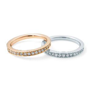 「エタニティ」とは、英語で“永遠”を意味します。リング全体、もしくは半周にわたって小さなダイヤモンドを連ねたデザインで、輝きが途切れないことから「永遠の愛」を象徴しています。
